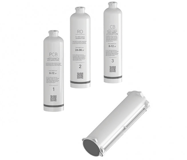 Aşama: 5 Mikron Sediment ve Granül aktif karbon Filtre – Sediment Kaba tortu filtresi olup suda bulunan kaba tortu ve partikülleri filtre ederek membran filtreyi korur ve optimum ömür sağlar. Granül Aktif Karbon Filtre 1. filtrede kaba malzemelerden ayrılıp bu filtreye gelen suyun içindeki klor, kötü koku ve tat veren gazlar, ağır materyallerin bir kısmı ve diğer kimyasal maddelerden ayrıştırılır ve bu sayede suyun tadı, rengi ve kokusu düzenlenir. Bu filtre hindistan cevizi kabuğunun 800°C oksijensiz ortamda yakılmasıyla elde edilmiş tuz halindeki karbon filtredir. Bir susam büyüklüğündeki aktif karbon taneciği bir futbol sahasını kaplayacak kadar moleküler yüzeye sahiptir. Bu sayede yarım kg’lık aktif karbon, yarım ton suyu arıtmaya yetecek kadar yoğun bir malzemedir. Aşama: RO Membran Filtre – 5 angstron gözenek çapına sahiptir. İlk aşamada kaba tortu ve partiküllerden ayrıştırılan suyu detaylı arıtmaya hazır hale getirir. İlk filtrenin asıl amacı membran filtresinin işini kolaylaştırmak ve ömrünü uzatmaktır. Özel yapım membran filtre olan membran filtre, suyun alkali seviyesinde neredeyse hiçbir değişiklik yapmaz. Arıtmanın en önemli aşamasıdır. Cihazın ana filtresi olan membran filtre, yarı geçirgen bir zar gibi hareket eder. Bitkilerin topraktan suyu emdiği gibi suyun içerisinden sadece yararlı maddelerin geçmesine izin verir. Tamamen doğaldır. Yüksek basınçla içinden sadece suyu geçirirken, mikron boyutunda suda var olan zararlı bakterileri, kireci, tortuyu, pası, asbesti, partikülleri ve ağır metalleri tamamen arıtır. Aşama: Post karbo filtre – Hindistan Cevizi Kabuğundan üretilir. Arıtılmış su, musluğa giderken, son kez Hindistan cevizi kabuğu filtreden geçer. Bu aşama, suyun mineral açısından zenginleşmesini sağlar ve tadını düzenler